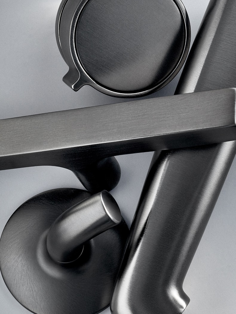 An elegant matte gray with visible brush lines, this finish eliminates reflection, creating a tonal experience that works in classic to modern environments.